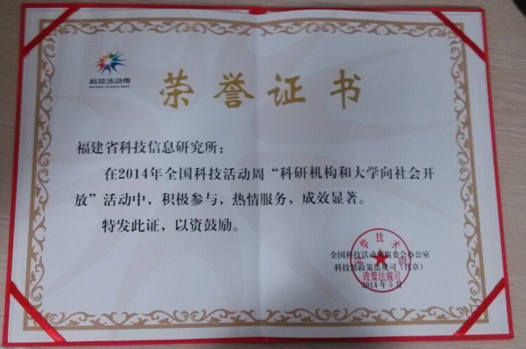 2014年5月17-24日全國舉辦了以“科學(xué)生活 創(chuàng)新圓夢”為主題科技活動周,在“科研機構(gòu)和大學(xué)向社會開放”活動中,我所福建省臺灣文獻(xiàn)信息中心科技館積極響應(yīng)組委會號召,將全館有關(guān)臺灣科技文獻(xiàn)資源以及其他相關(guān)文獻(xiàn)資源免費對外開放,熱情周到服務(wù)到館人員,獲得了全國科技活動周組委會辦公室一致好評并頒發(fā)榮譽證書。